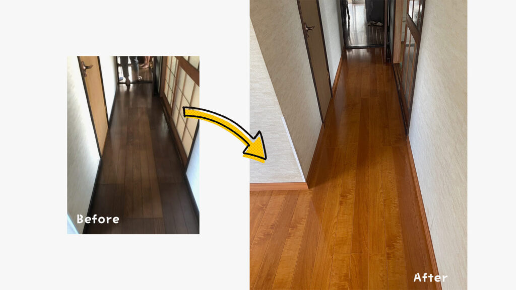 内容 | 廊下とダイニングのフローリング上張り |