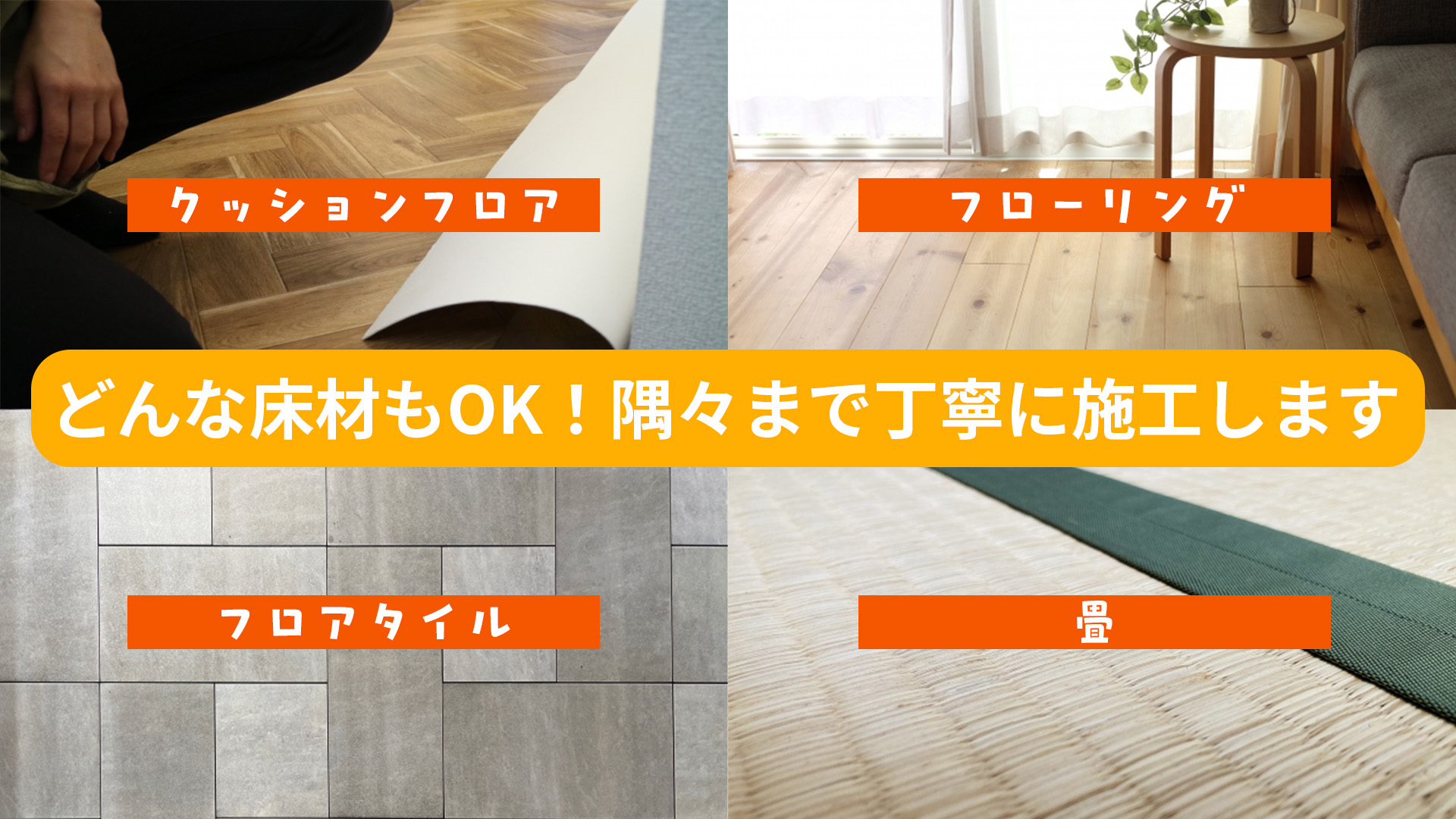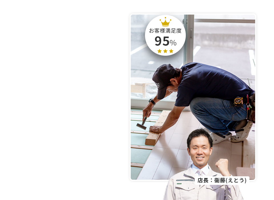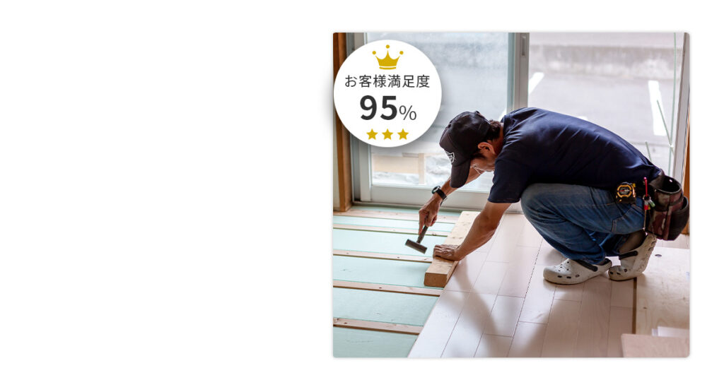 メッセージ:床は毎日歩く場所だからこそ、剥がれや傷、きしみ音などがあると気になってしまうものです。「自分で張り替えてみようかな」と思っても、実際は重労働で、きれいに仕上げるのはとても難しいのが現実です。