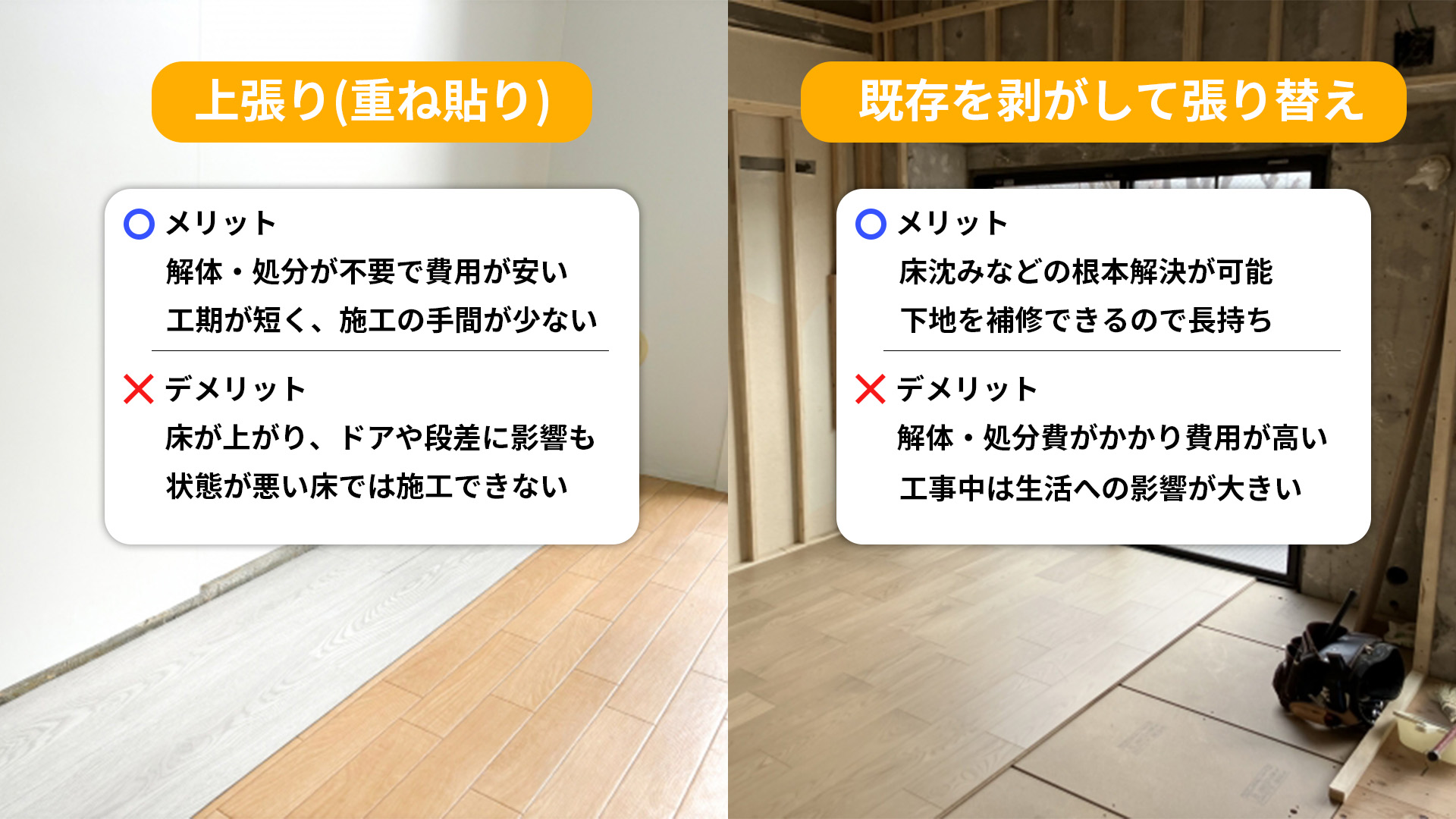費用をできるだけ抑えたいなら上張りがおすすめですが、床のたわみや沈みなど根本的な問題を解決したい場合は、張り替え工事が適しています。