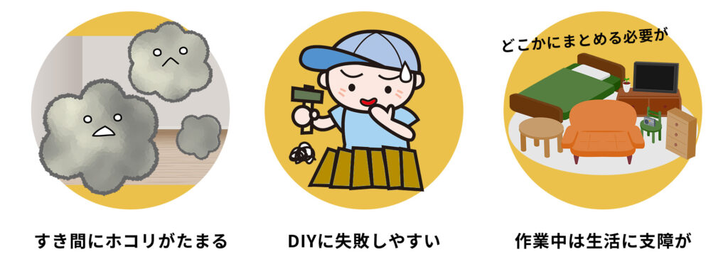 特に床は思っている以上に凹凸が多く、隙間ができるとゴミやホコリが溜まってしまい、見栄えだけでなく衛生面でも問題が起きがちです。DIYで挑戦しても「仕上がりに納得できなかった」という声は少なくありません。